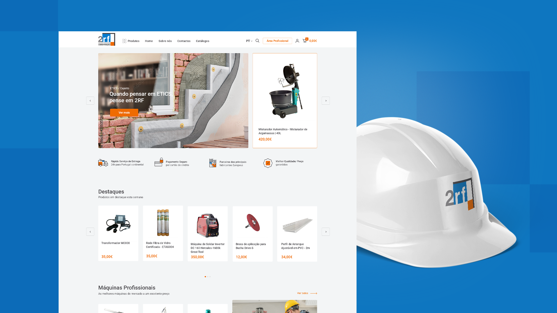 O B2B da 2RF apresenta um layout de navegação otimizado para a venda de produtos e equipamentos para a indústria da construção. Está desenhado com uma paleta de cores predominantemente cinza e accents em azul e laranja para destacar botões de ação, informações relevantes e separar visualmente as áreas de cliente. Tudo com um carrinho de compras claro e um checkout simplificado, garantindo uma experiência de compra eficiente.