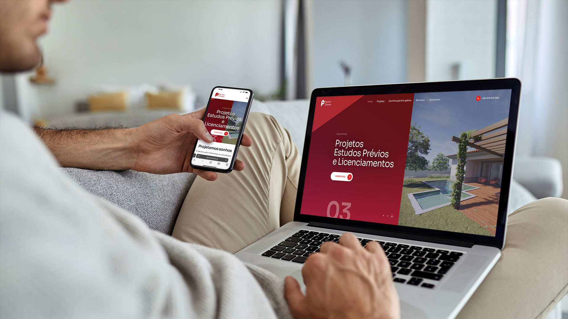 Paulino Oliveira, um gabinete que atua nas áreas da arquitetura, engenharia, licenciamentos e coordenação de obras, com soluções dirigidas a clientes empresariais e particulares. Este também é o mundo da certificação energética. O website reflete os valores da marca — organização, rigor, competência e acessibilidade, com destaque para os tons vermelhos da identidade e elementos visuais ligados à natureza, simbolizando equilíbrio e responsabilidade ambiental.